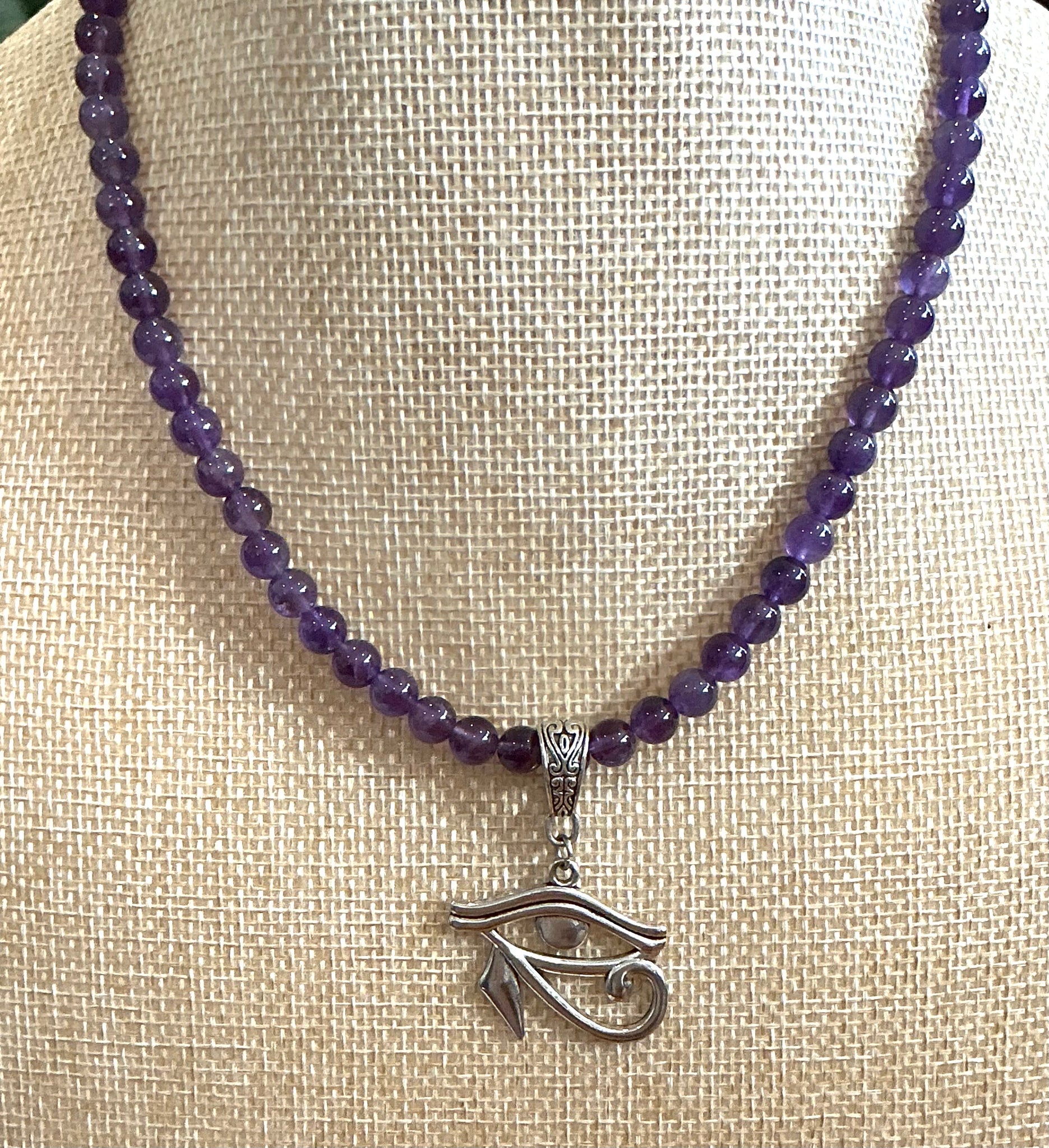 Amethyst Beaded Necklace with Eye of Heru Pendant – Handmade Intuition & Protection Jewelry