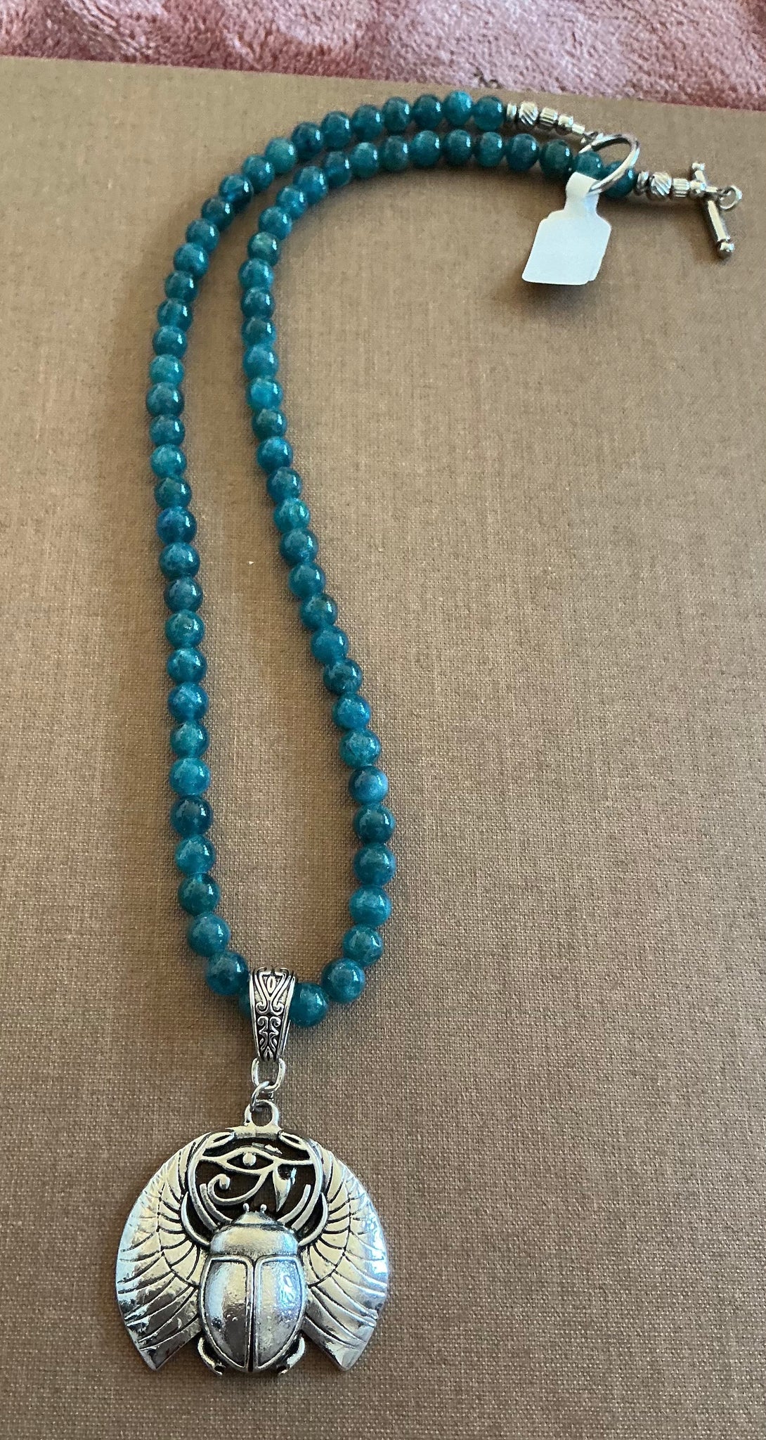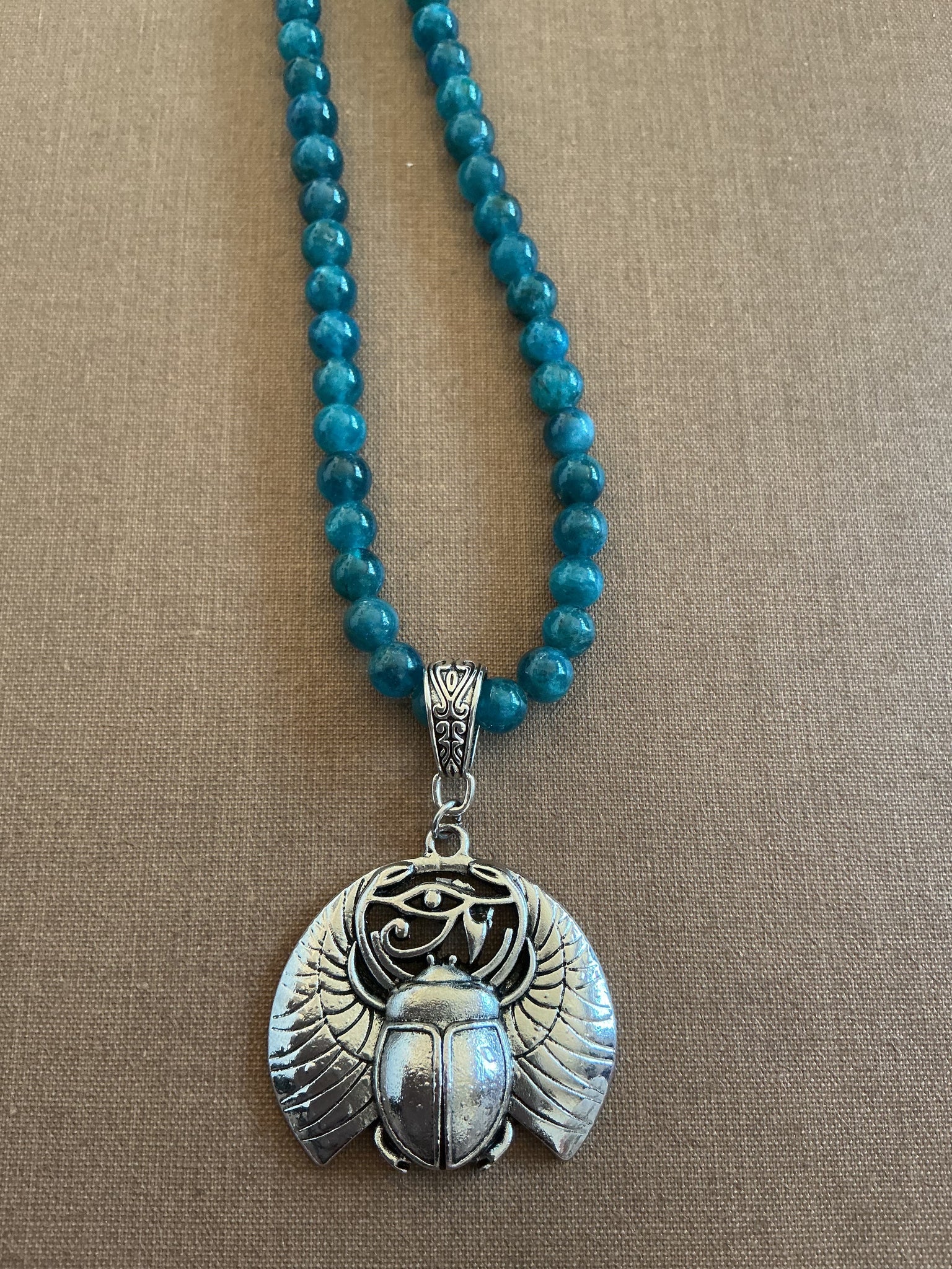 Blue Apatite Beaded Necklace with Winged Kheper (Khepri) Pendant – Handmade Transformation & Higher Vision Jewelry